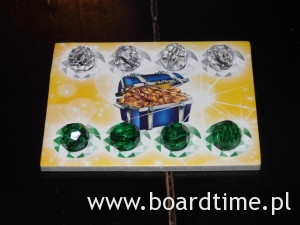 Oprócz tego znajdziemy w środku: klejnoty, woreczek i planszetki graczy (płytki z dziurkami, gdzie będziemy umieszczać zdobyte w czasie gry skarby).