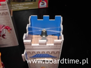 Acha, no właśnie… W środku mamy również dwa nieduże dzwoneczki. Przed pierwszą rozgrywką jeden mocujemy (za pomocą gumki) do rycerza, a drugi do dowolnej wieży (żółtej, niebieskiej bądź czerwonej – zielona wieża w pewnym sensie „nie gra”).