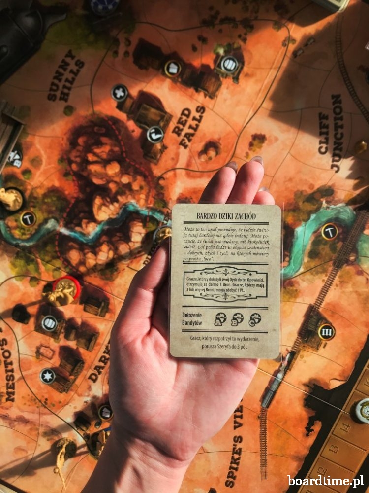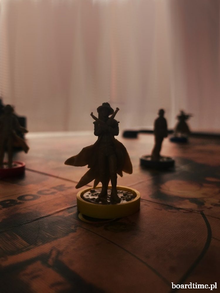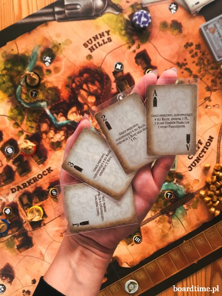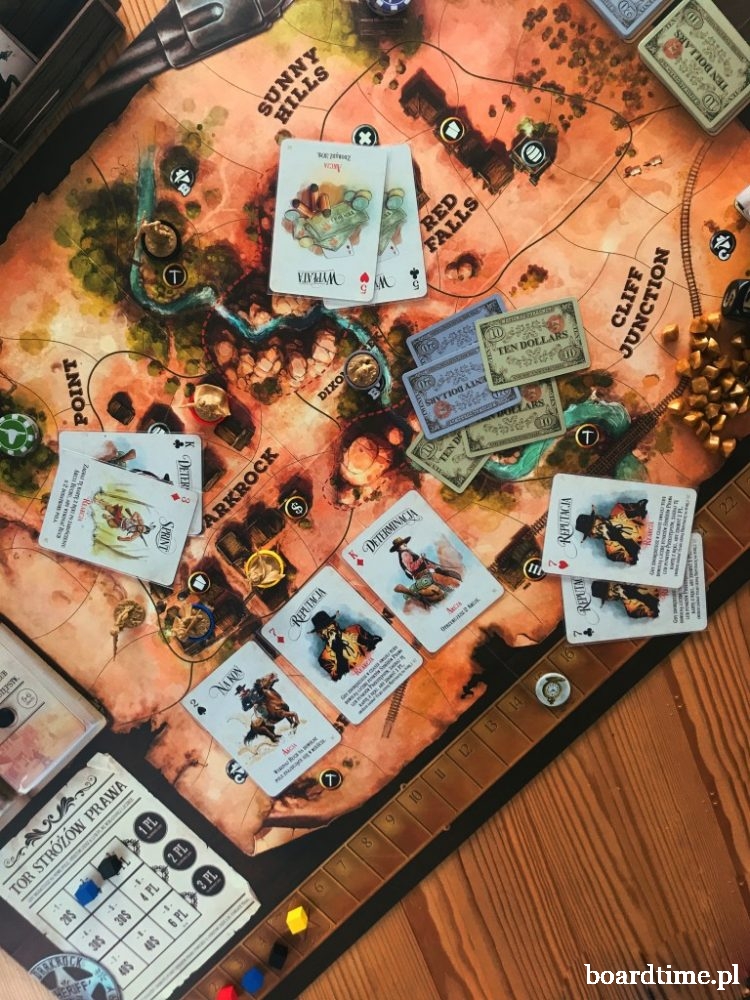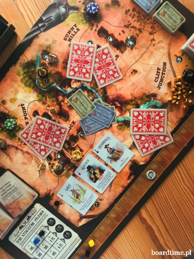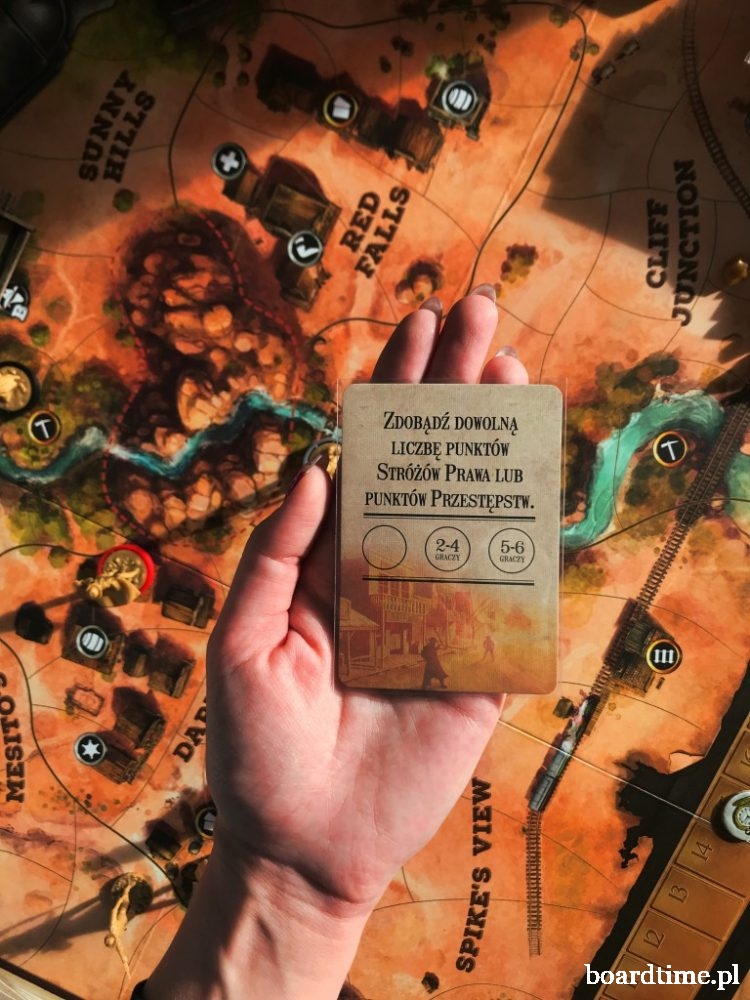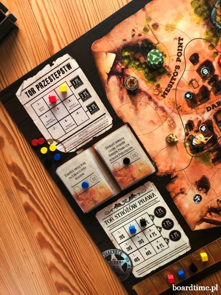 Nie ma też znaczenia, czy gra się „dobrym” czy „złym”, choć na pierwszy rzut oka wydaje się, że bycie przestępcą jest bardziej lukratywne – ok, Punkty Legendy zdobywa się może trochę szybciej, ale trzeba grać znacznie bardziej ryzykownie, uciekać przed innymi graczami i zdecydowanie bardziej pilnować tego, co się dzieje na planszy. Stróże Prawa natomiast mają dużo łatwiejszy dostęp do pieniędzy, nie muszą obawiać się Szeryfa i, jeśli nagle zdecydują, że dosyć już tego bycia dobrym, w dowolnym momencie mogą stać się Przestępcami (źli za to nie mają tak łatwo, bo mogą się „nawrócić” dopiero po Aresztowaniu – co też zresztą bardzo mi się podoba, bo jest mega klimatyczne).