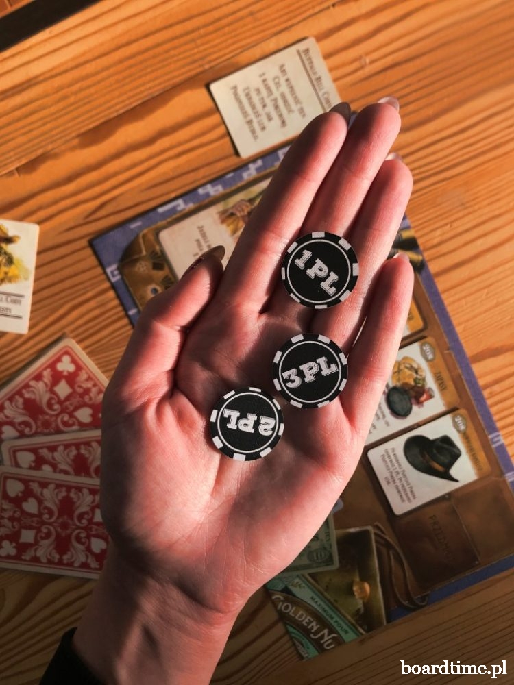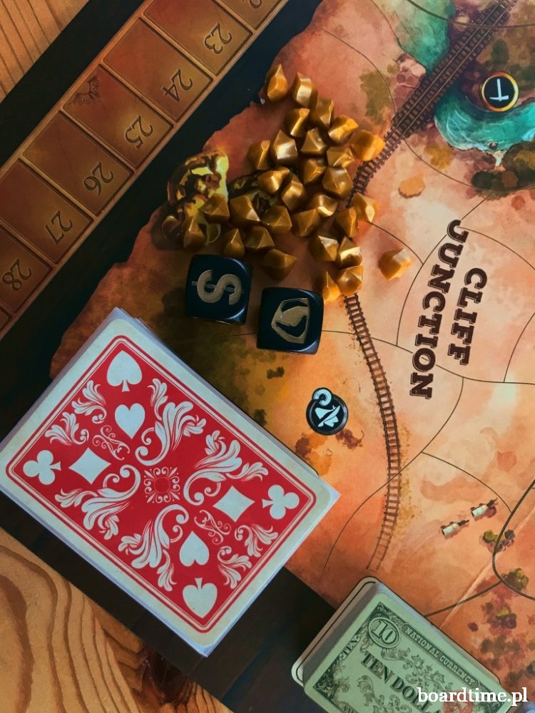 W sumie nie trzeba było długo szukać, bo po szybkiej analizie doszłam do wniosku, że w Western Legends tak naprawdę nie ma rzeczy, która mi się nie podoba. Najwięcej dobrego robi tu na pewno ten RPGowy klimat, przy czym, chociaż lubię RPG, w których dużo się rzuca, podoba mi się to, że Western Legends jest bardziej o wejściu w rolę i odgrywaniu jej i mimo, że ma elementy gry przygodowej, nie ma tej bezsensownej i męczącej losowości (której na przykład mnóstwo ma Robinson Crusoe, przypomnijmy: top 3 moich najbardziej znienawidzonych gier). Losowe wychodzenie Kart Opowieści w zasadzie nie ma znaczenia, bo to po prostu mini-questy które można – ale nie trzeba – realizować, sprawdzanie powodzenia wydobycia złota rzutem kością jest po pierwsze: kompletnie uzasadnione (bo żeby wydobyć złoto trochę farta trzeba jednak mieć) i po drugie: zwykle jednak daje jakąś nagrodę, nagrody z żetonów bydła wszystkie są super, więc nie ma różnicy który wylosujemy i właściwie jedyna realnie wpływająca na rozgrywkę losowa rzecz to karty pokerowe, ale i z nimi nie jest tak, że sytuacja zawsze będzie tragiczna i nie da się jej zmienić, tym bardziej, że zwykle mają jakieś dodatkowe Akcje, Reakcje lub Bonusy. Dalej – bardzo podoba mi się wykorzystanie różnych mechanik. Mamy i dice rolling w Kopalni, i pick-up-and-deliver na Ranczu, i granie w pokera w Saloonie (uwielbiam, moja totalnie ulubiona akcja) i wiadomo, point-to-point movement, bo przecież podróżujemy po mapie. Do tego oczywiście (bo to Dziki Zachód!) klasyczną walkę gracz vs gracz lub nieco mniej klasyczną gracz vs gra: „mniej klasyczną”, bo bardzo ciekawie rozwiązaną – walczyć można z Bandytami, Strażnikiem w banku lub Szeryfem i każdego z tych Bohaterów Niezależnych reprezentuje inny gracz, a walka odbywa się przez wybranie 1 z odpowiednio 2, 3 lub 4 kart (w zależności od tego, z jakim BN się walczy) pamiętając, że im wyższa karta, a więc wyższa szansa na pokonanie gracza, tym też lepszy bonus może on dostać. Poza tym są jeszcze tory Stróżów Prawa i Przestępstw – jest naprawdę różnorodnie, a przy tym ja jestem zdania, że nie jest tak, że niektóre Akcje są znacząco lepsze. Czasem w ciągu 2 tur można totalnie zmienić punktację, kluczem jest po prostu – ale zaskok! – wykonanie odpowiedniej akcji w odpowiednim momencie.
