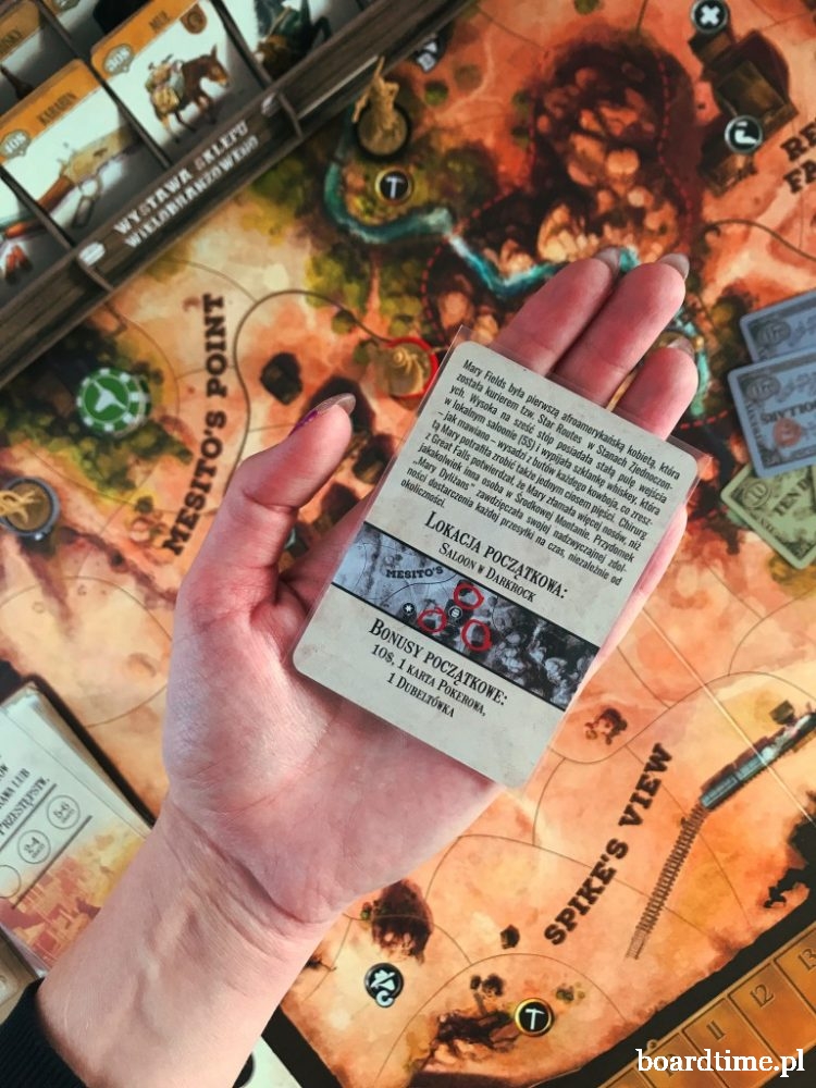 Na początku gry każdy z graczy wybiera postać, którą będzie grał, może (wypadałoby) zapoznać się z jej biografią, a następnie przygotowuje przypisany jej ekwipunek i ustawia swoją figurkę w lokacji początkowej – zwykle obydwie te rzeczy są biograficznie mocno uzasadnione, stąd moja porada na temat przeczytania tych kilku zdań. Zresztą w ogóle w Western Legends klimat naprawdę ma kolosalne znaczenie, więc przyjmijmy jako jedną z najważniejszych zasad tej gry, że trzeba czytać wszystkie teksty fabularne i nie podlega to absolutnie żadnej dyskusji.