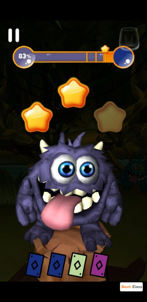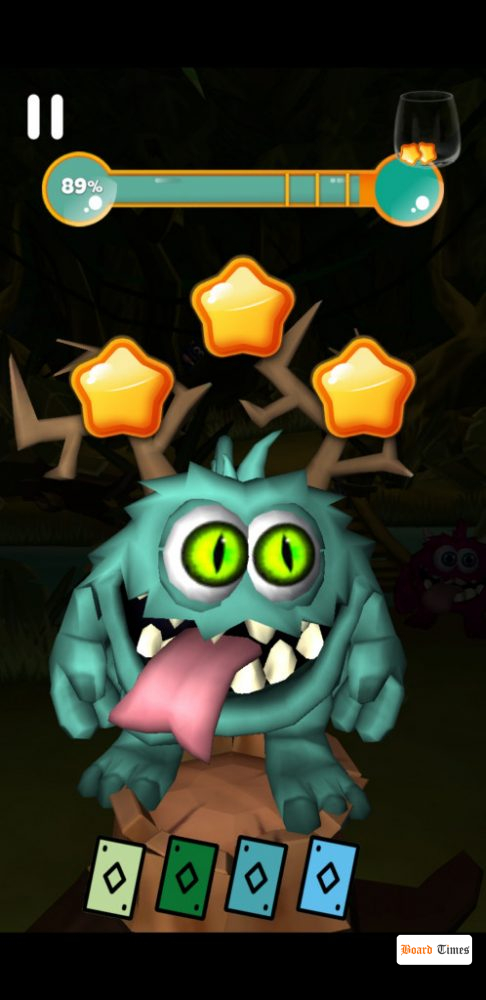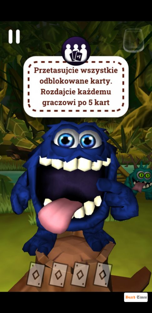 Warto dodać, że apka oferuje nam dwa tryby zabawy: imprezowy i fabularny. Ten pierwszy to po prostu krótka, pojedyncza rozgrywka, z kolei drugi oferuje coś w rodzaju kampanii, w trakcie której przechodzimy łącznie przez piętnaście poziomów w czterech różnych lokacjach, odblokowując nowe stworki i przedmioty. Początkowa talia kart szybko się rozrasta, a poziom trudności kolejnych etapów wzrasta, choć powiedziałbym, że raczej delikatnie.