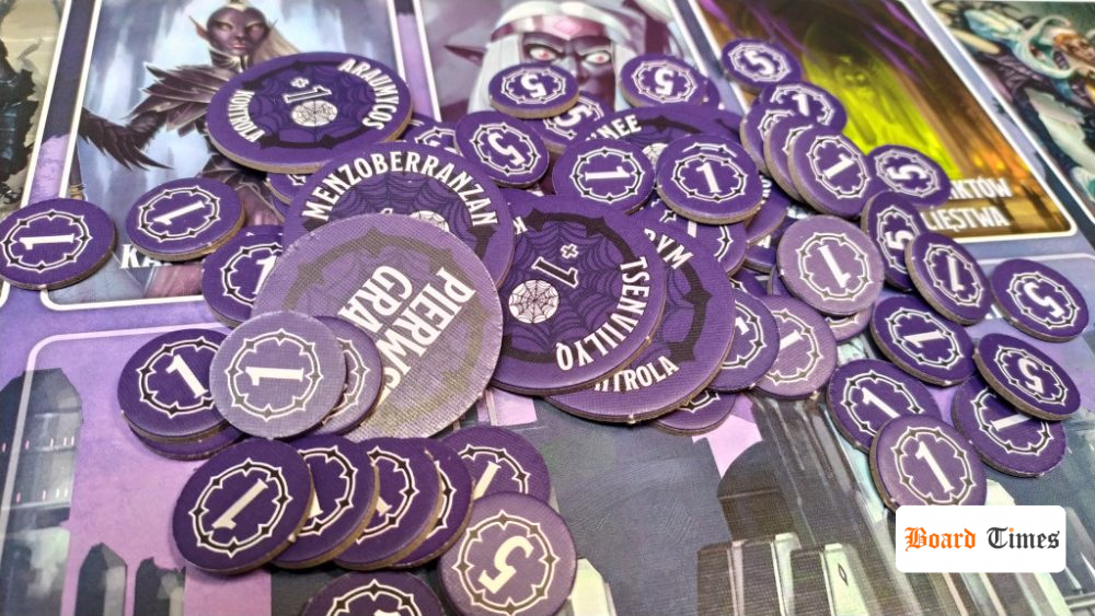 Niestety należę do tych ludzi, którzy grali w pierwsze wydanie i widzieli figurki tarcz i szpiegów, więc pierwsze co rzuciło mi się w oczy to ich brak. Zdecydowano się na zastąpienie ich tekturowymi żetonami, zapewne w celu obniżenia kosztów. Nie byłoby w tym nic złego, gdyby powiększono planszę, lub chociaż pola na niej, ponieważ są one naprawdę malutkie. Co gorsze – druk tych żetonów jest przesunięty i wygląda bardzo niechlujnie. Plansza jest ładna, ale zostawiono na niej stare tłumaczenie – Tyrani Underdarku, które może nie przeszkadza samo w sobie, ale razem z przesunięciami czy brakiem wspominanych w instrukcji żetonów Wewnętrznego Kręgu, sprawia wrażenie amatorszczyzny.
