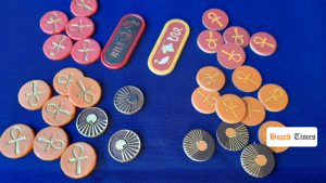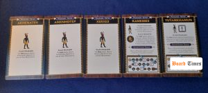 - ODBLOKOWANIE MOCY ANKH – płacimy nadrukowaną na naszej planszetce ilość wyznawców i przesuwamy znacznik Ankh z dołu planszetki na wybrane przez nas pole obok opisanej zdolności. Gry na dolnym pasku pod znaczkiem Ankh pojawi się dodatkowo symbol skarabeusza – dodajemy do puli jedną figurkę Strażnika danego poziomu, o ile jeszcze jakieś figurki są dostępne. Strażnicy to figurki obdarzone dodatkowymi zdolnościami, które (w zależności od sytuacji) mogę bardziej lub mniej przydać nam się na polu bitwy. Należy pamiętać, że żetony zdejmujemy w kolejności od lewej do prawej, więc możliwość odblokowania zdolności z wyższych poziomów, jak również otrzymania Strażnika wyższego poziomu, będziemy mieli dopiero po odblokowaniu zdolności z poziomów niższych.