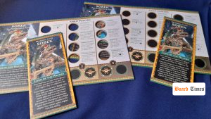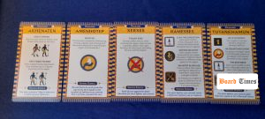 Na koniec warto wspomnieć, że mamy aż trzy tory (technicznie 6, bo są 4 tory akcji), po których będą poruszać się znaczniki graczy. O ile tory Oddania i Akcji nie wymagają specjalnych objaśnień, o tyle działanie poszczególnych symboli na torze Wydarzeń warto przybliżyć wszystkim przed rozpoczęciem rozgrywki, bo tam uruchamiane są kluczowe momenty w grze. Tor Wydarzeń również pokazuje, kiedy najsłabsi gracze mają połączyć swoje bóstwa lub ewentualnie odpaść z gry jeżeli w momencie osiągnięcia określonego pola przez znacznik na torze Wydarzeń, ich znaczniki nadal znajdują się w czerwonej strefie.