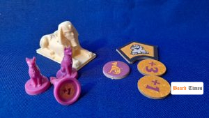 Jedynym dodatkiem, który będzie dość trudny do zastąpienia jest figurka i karta dodatkowego strażnika – Petsuchosa, która (moim skromnym zdaniem) bardzo dobrze wpływa na balans rozgrywki. Sposób jej działania jest banalny – po każdym cyklu bitewnym Petsuchosa dostaje osoba posiadająca aktualnie najmniej punktów Oddania. Petsuchos ma aż 3 punkty siły i (w przeciwieństwie do innych figurek) zajmuje 2 pola, tak więc najsłabszy-w-danym-momencie gracz dostaje nie lada doładowanie i motywację do dalszej walki o dominację na egipskiej ziemi – nawet jeżeli do tej pory nie szło mu zbyt przebojowo. Jeżeli ktoś zakupił grę w przedsprzedaży, rodzimy wydawca dorzuca akurat tą figurkę jako bonus, więc osoby, które zamówiły w ten sposób z pewnością nie będą żałować!