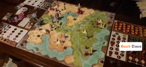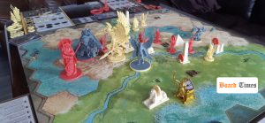 Dlaczego wspomniałem o Reinerze Knizii? To chyba pierwsza albo jedna z nielicznych gier autorstwa Erica Langa, w której plansza podzielona jest na heksy. Do tej pory wykonując popularną akcję Ruch, zwykle mogliśmy swobodnie poruszać się do przyległych prowincji lub latać frywolnie, gdzie dusza zapragnie, jak to miało miejsce w Blood Rage. Tym razem jest inaczej – możemy poruszyć się każdą figurką jednorazowo do trzech pól i mamy do wyboru aż 6 kierunków. Dodatkowo możemy przechodzić również przez zajęte pola i tereny wodne. Warunkiem wykonania akcji jest zakończenie ruchu na pustym polu, nie będącym wodą.