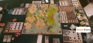 Plansza jest minimalnie większa od tej w Blood Rage, ale mniejsza od planszy do Rising Sun. Razem z planszetkami graczy, torami i ewentualną planszetką z dodatku potrzebne jest jeszcze miejsce na trzy karty oraz figurki Strażników, jak również dodatkowe komponenty tj. figurki wielbłądów i żetony Wyznawców. Wszystko to sprawia, że gra wymaga bardzo dużo miejsca na rozegranie nawet 2-osobowego pojedynku. Przy trzech osobach musieliśmy robić dostawki do stołu. Rozegrałem też kilka partii 5-osobowych, ale do tego trzeba już dysponować odpowiednich gabarytów blatem.