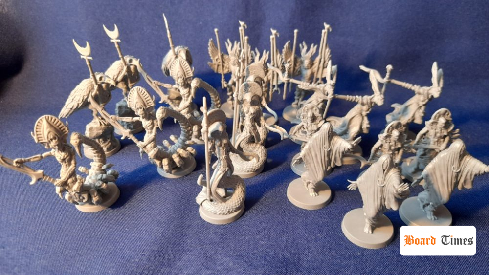 Komponentów jest tyle, że można symultanicznie doznać oszołomienia, euforii, ekscytacji, ale i pewnego rodzaju rozbicia…. bo jak to wszystko w miarę szybko ogarnąć? Wydawnictwo CMON jak zwykle wyciąga pomocną dłoń – figurki są poukładane w zgrabnych wypraskach, a te dodatkowo w kartonowych pudełkach, które dopiero docelowo mieszczą się w ozdobionych przepięknymi ilustracjami Adriana Smitha głównych pudłach. Ktoś może powiedzieć Bomba – pudełka w pudełkach!, ale dzięki temu wszystko ładnie trzyma się we właściwym porządku, a dodatkowo – po pomalowaniu figurki nie będą się odbijać.