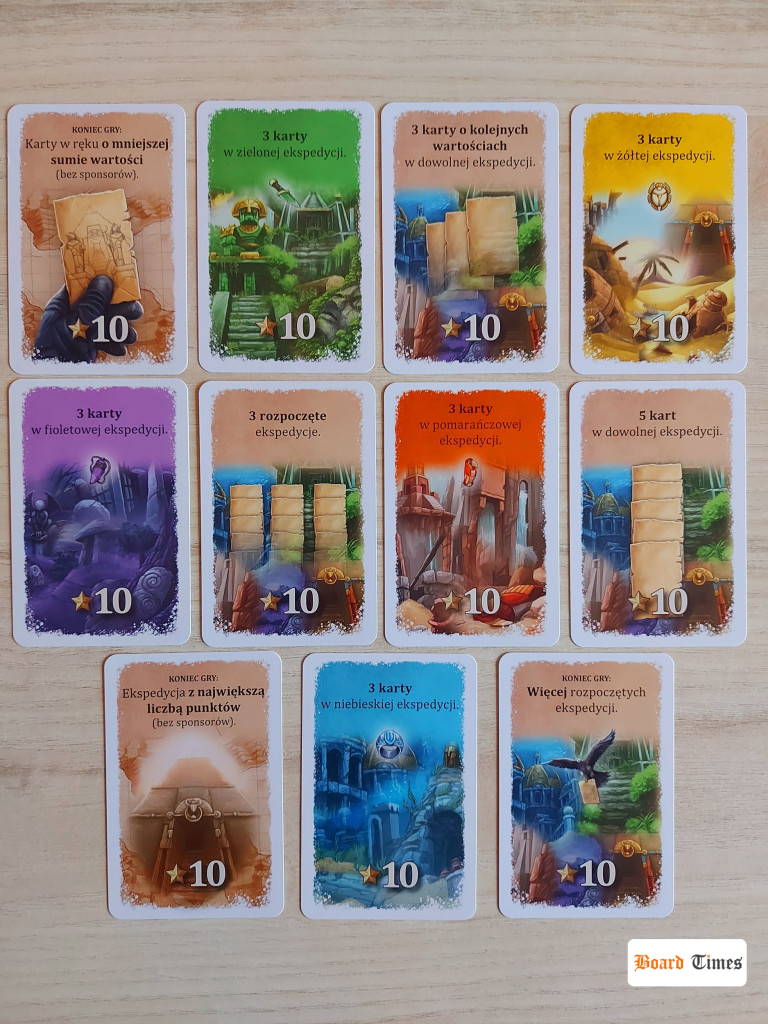 Momentami naprawdę jest się nad czym zastanawiać, a przecież to jeszcze nie wszystkie niuanse podejmowanych przez graczy decyzji, gdyż są jeszcze oni: tajemniczy sponsorzy! W każdym kolorze są trzy karty sponsorów, które mnożą wynik danej ekspedycji. I tu dwa haczyki: sponsorów można zagrać tylko jako pierwsze karty w danej ekspedycji, a do tego ich obecność mnoży wynik punktowy uzyskany dopiero po odjęciu kosztu 20 punktów.