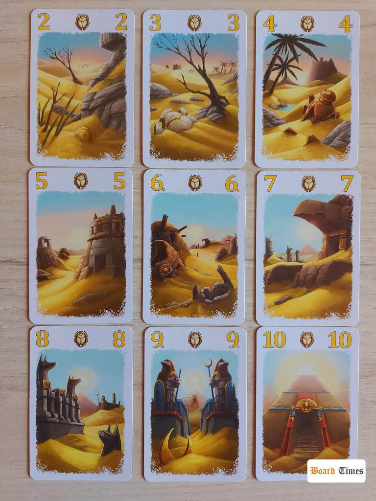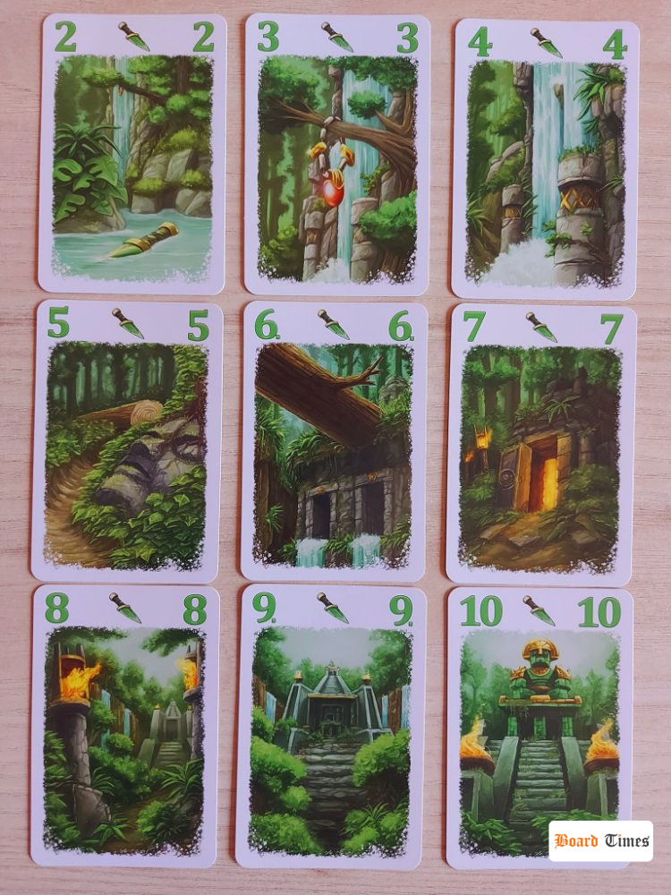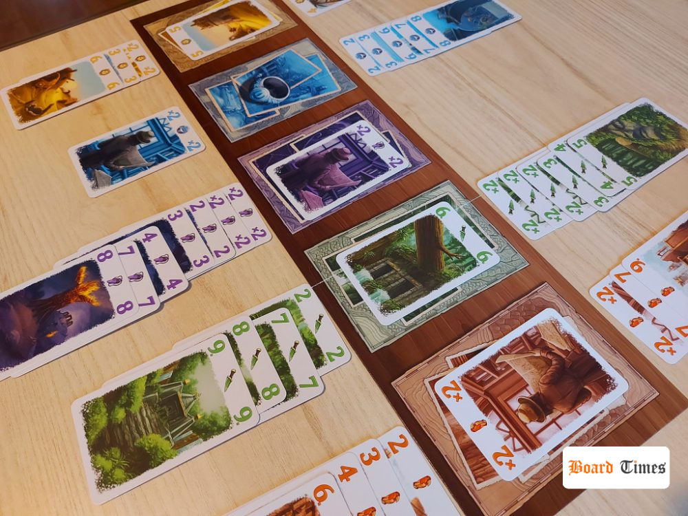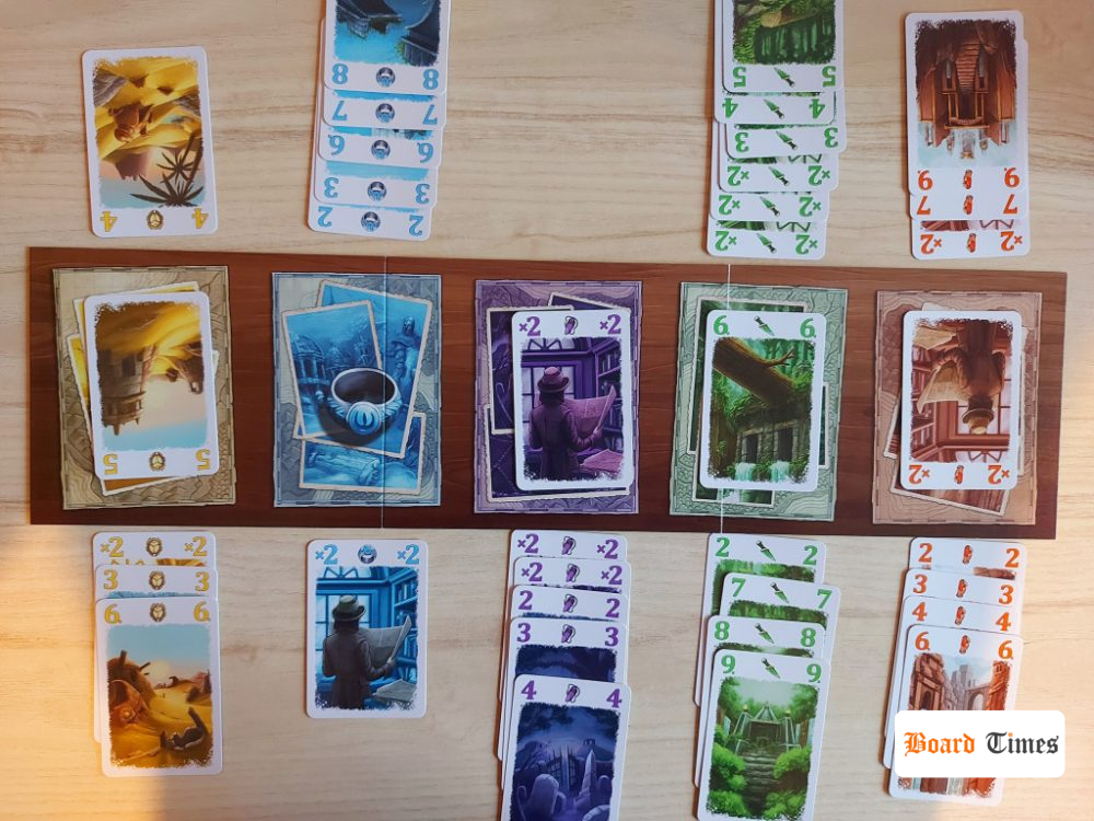 Karty możemy zagrywać do swojej ekspedycji w danym kolorze i wówczas każda kolejna karta musi mieć wartość większą od poprzedniej. Alternatywnie można też zagrywać je do obozów, czyli na tzw. „wystawkę”, z której potem dowolny gracz może dobrać dowolną odkrytą kartę. Celem graczy jest zebranie jak najmocniejszych (czytaj: najlepiej punktujących) ekspedycji, co brzmi nudno i banalnie, ale… W tym miejscu do gry wchodzi twist, który sprawia, że Zaginione Miasta zaczynają błyszczeć.
