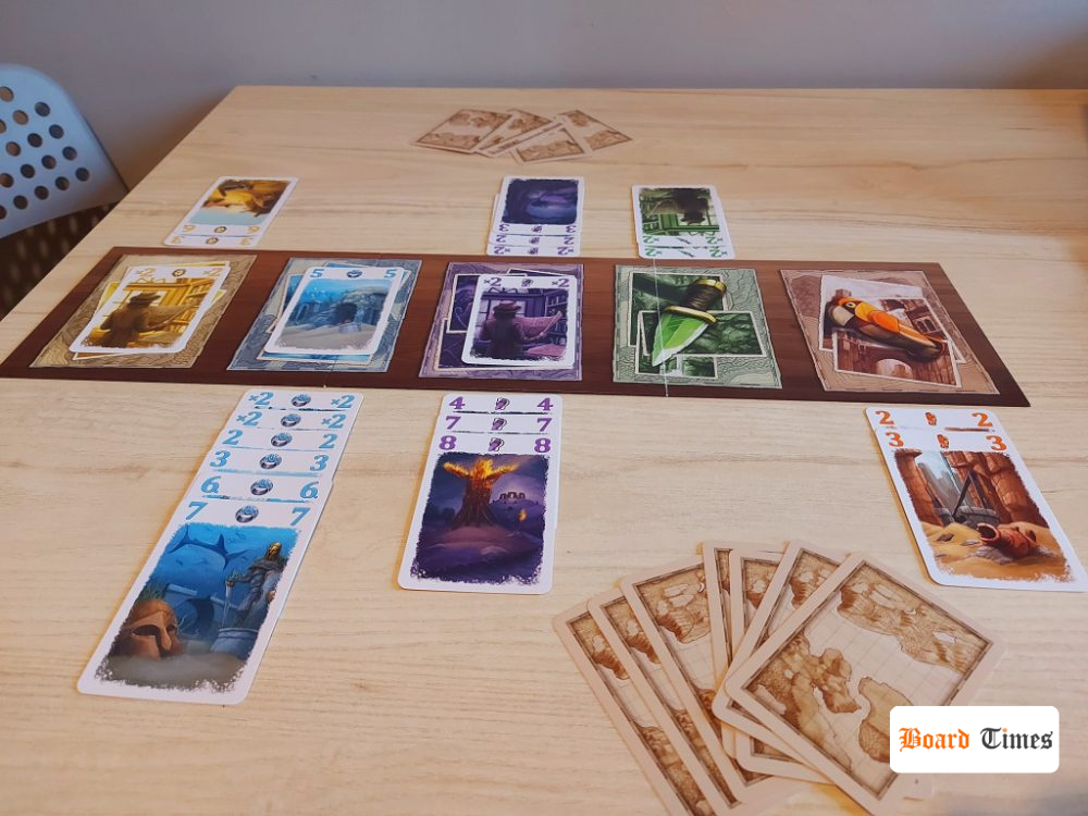 Powyższe rozwiązanie sprawiło jednak, że łączny czas rozgrywki stał się dla mnie pewnym minusem. Pudełkowa informacja głosi, że Zaginione Miasta: Pojedynek są tytułem na 30 minut zabawy, a mi się jakoś nigdy nie udało zmieścić poniżej 40 minut, licząc oczywiście jedną rozgrywkę jako trzy rozdania, zgodnie z instrukcją. Przy czym zaliczyłem też np. dwie partie trwające godzinę. Chyba po prostu liczyłem na to, że gra będzie bardziej typowym fillerem, jeżeli chodzi o łączny czas rozgrywki. Ale biorąc pod uwagę, że na ten czas ma wpływ również trzykrotne liczenie punktów (bywa nieco uciążliwe), a kwestia szybkości podejmowania decyzji przez graczy jest sprawą indywidualną, to ostatecznie nie ma w tym nic dziwnego.