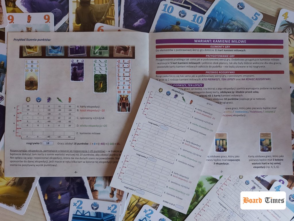 Każda ekspedycja to duży wydatek, dlatego niezależnie od liczby dołożonych do niej kart (wystarczy co najmniej jedna), gracze muszą ponieść koszt wyprawy: minus 20 punktów. Nikt nie mówił, że organizacja ekspedycji będzie łatwa i tania! A szastanie kartami i zaczynanie bez namysłu każdego seta, tzn. ekspedycji, może się dla gracza skoczyć nawet ujemnym wynikiem punktowym.