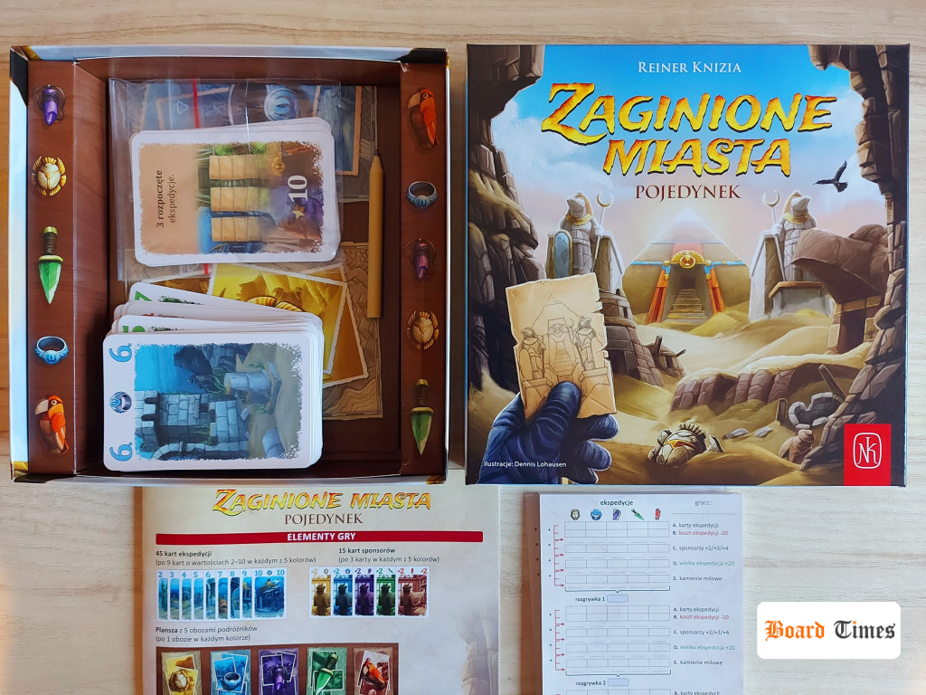 Zawartość nowego wydania Zaginionych Miast raczej niczym szczególnym Was nie zaskoczy, ale też nie zawiedzie. Mamy przede wszystkim talię solidnej jakości kart o rozmiarach 65×100 mm, planszę i notes punktacji. Plus dla polskiego wydawcy, że dołączył również ołówek (z logo Naszej Księgarni) oraz – co ma w swoim zwyczaju – naklejkę, dzięki której możemy podpisać i oznaczyć swój egzemplarz gry.