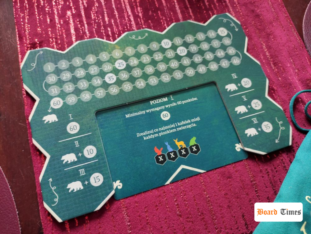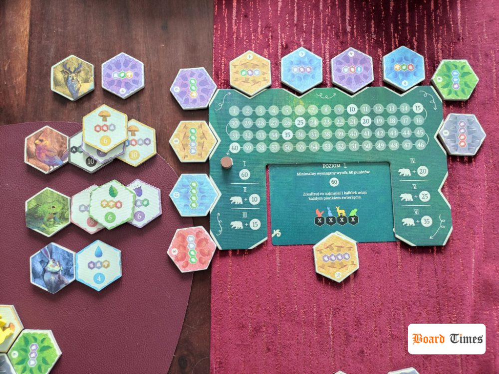 W niezbyt dużym pudełku mamy miejsce przede wszystkim na gustowny worek, który mieści kafelki lasu. Każdy z nich zawiera z jednej strony kolor, a z drugiej misję (z kombinacją kafelków i wartością punktową). Poza tym mamy tu jeszcze 4 zestawy zwierzątek. Każdy z graczy będzie je wykładał na swoje misje, by to one przechadzały się po ścieżkach (i zbierały punkty). Do tego mamy całkiem pokaźny zestaw do gry solo: specjalną planszę, zestaw kart (z 6 poziomami trudności), wielkiego drewnianego niedźwiedzia i kafelki zwierząt.