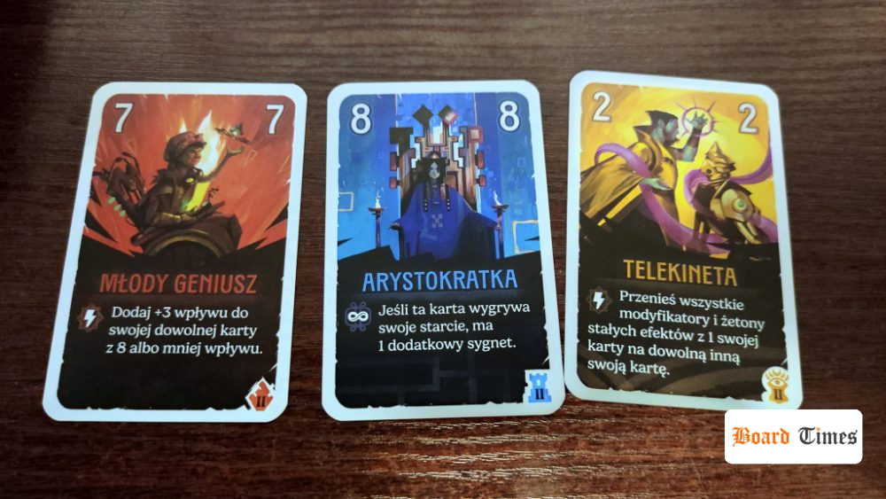 Cardia to bardzo ciekawe podejście do klasycznych gier pojedynkowych. Najczęściej to wyższa karta zgarnia wszystko. Tu niższa często potrafi zamieszać dużo bardziej. Czasem wręcz nastawiamy się na zagranie niższej karty, żeby jej efekt popsuł szyki przeciwnikowi. Może się więc okazać, że ktoś zagrał najwyższą 16-tkę, ale co z tego, gdy po naszej stronie pojawił się wyszkolony zabójca i sprzątnął tego gościa z powierzchni. Niby zdobył sygnet, ale naprawdę na krótko. Trzeba tu się mieć na baczności.