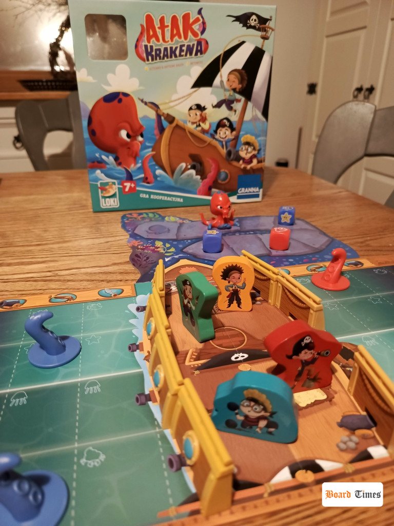 Efektowne wykonanie: Trójwymiarowa plansza statku, plastikowe figurki macek, drewniane pionki z rysunkami bohaterów i duży, pomalowany Kraken budują klimat rozgrywki.