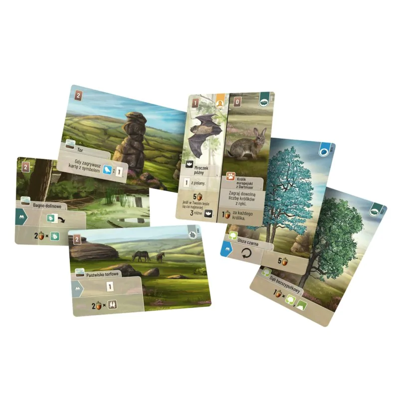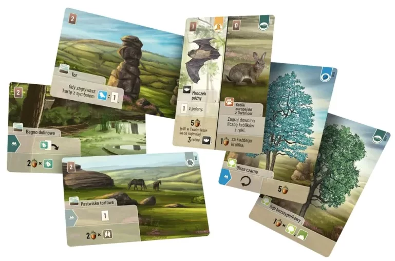 Klimatyczna spójność: Zależności między kartami (drapieżnik-ofiara, środowisko) są bardzo logiczne i mocno osadzone w realiach wrzosowisk (myszołowy, żmije, kucyki, specyficzna roślinność).