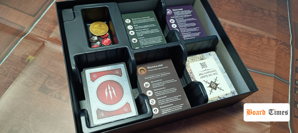Gwint jest wydany solidnie – znajdziemy tutaj tak matę (szkoda, że papierowa, ale wiadomo, koszty) jak i wszystkie potrzebne żetony do gry. W wyprasce znajdziemy również tonę kart dla każdej z pięciu frakcji. Cieszy dodanie Skellige, która to frakcja nie została wcześniej wydana. 436 kart frakcji, jak mówi instrukcja, daje prawie 90 kart na frakcje! Jeżeli weźmiemy pod uwagę, że przeciętna talia ma około 33 kart – daje to spore możliwości przebudowy.
