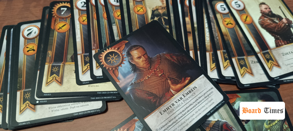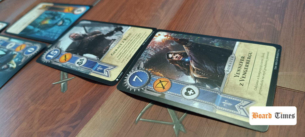 Budowanie talii daje spore możliwości, ale niektórych kart nie warto brać. Są za słabe i zupełnie niepotrzebne, więc oczywistością jest, że nikt nie weźmie karty o sile 4 ponad Ciri z siłą 15 i odpornością na efekty pogodowe. W grze video miało to sens, bo karty zdobywaliśmy podczas gry – czy to kupując czy zdobywając w pojedynkach i rozbudowywaliśmy talię podstawową. Był też aspekt kolekcjonerski, bo zdobycie ich wszystkich łatwe nie było. Tutaj otrzymujemy wszystko na start, więc dobra połowa z tych prawie 90 kart na frakcję nigdy nie wyląduje na stole. Zabrakło w mojej opinii przemyślenia tego aspektu i dodania jakiegoś trybu z draftem kart.