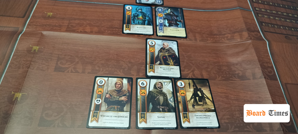 Oczywiście są pewne ograniczenia w budowaniu talii – musimy mieć jednego dowódcę, co najmniej 22 karty jednostek oraz maksymalnie 10 kart specjalnych. W grze turniejowej wchodzą kolejne obostrzenia, jak ograniczenie szpiegów itp. Po zbudowaniu talii rozkładamy planszę i możemy zaczynać. Z potasowanej talii dobieramy 10 kart, które muszą nam starczyć na całą grę, wybieramy losowo kto zaczyna i ruszamy do boju!