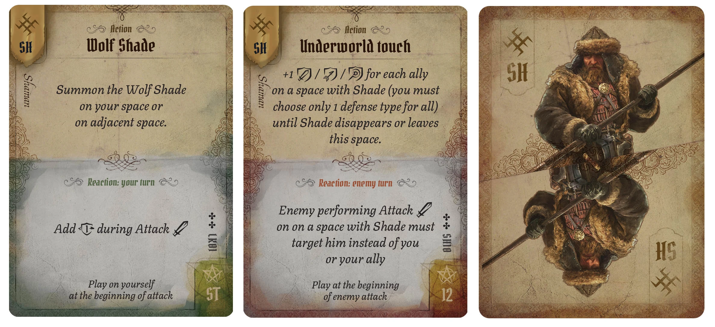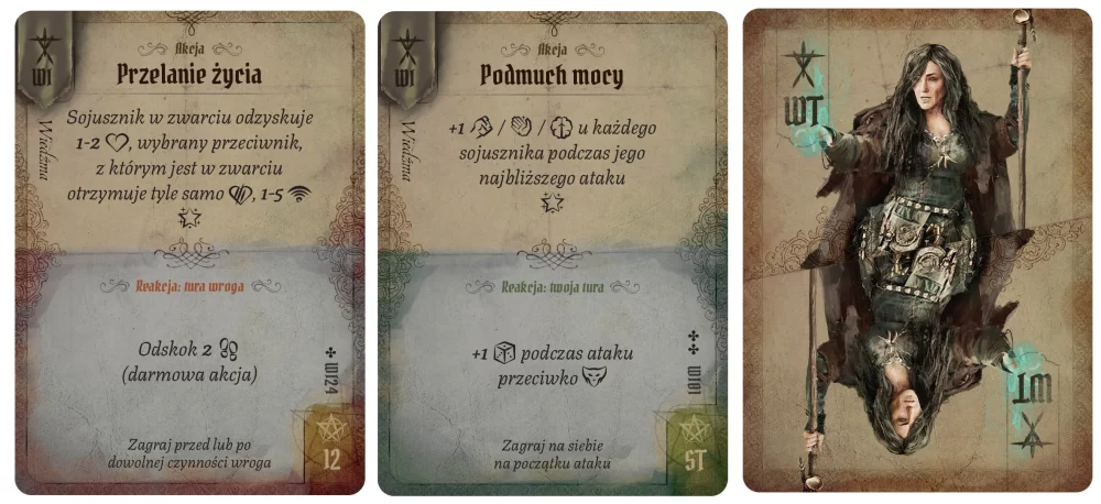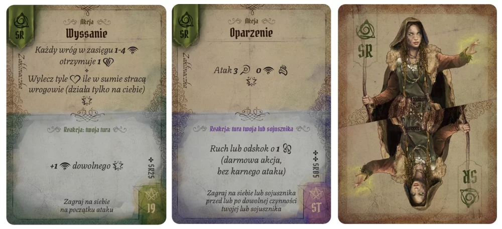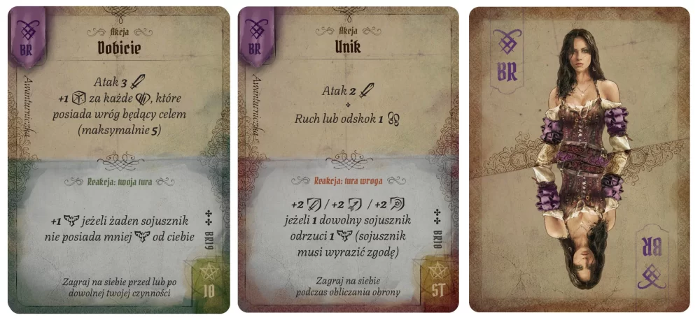 Dolna połowa (Reakcja): Pozwala na uzyskanie dodatkowego efektu, który może wzmocnić akcję własną, wesprzeć sojusznika lub stanowić bezpośrednią odpowiedź na działanie przeciwnika.