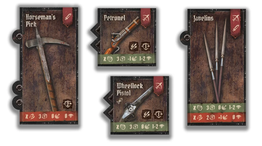 Wyposażenie prezentowane jest w formie żetonów zajmujących od 1 do 3 pól (slotów) na planszetce. Można je kupować w miastach, zdobywać w nagrodę lub wytwarzać samodzielnie w wozie łowców.