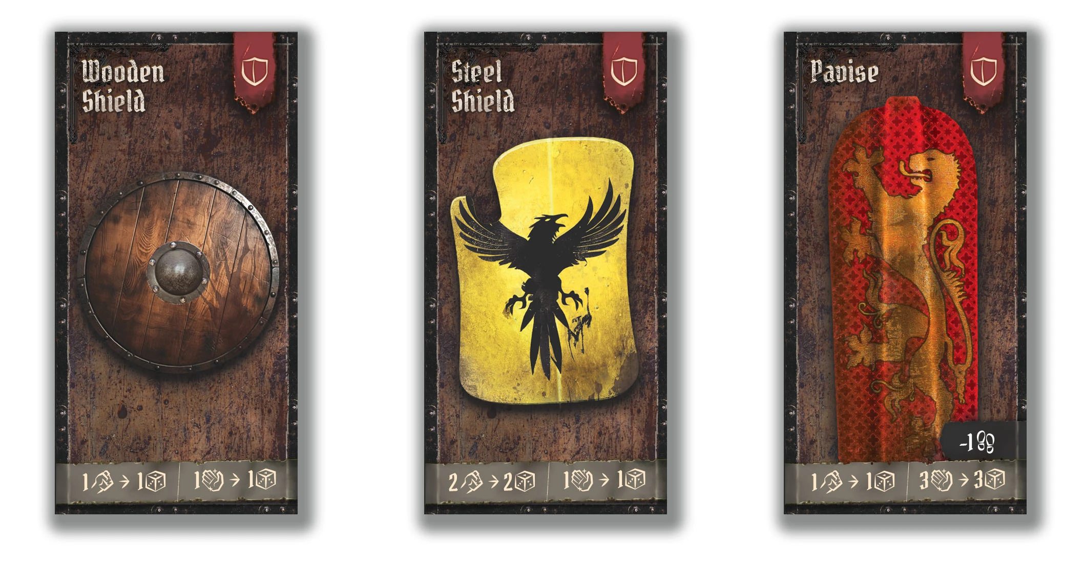 Tarcze zajmują 1 lub 2 sloty na broń i mogą być użyte przeciwko atakom wręcz i dystansowym. Ich użycie zamienia Siłę lub Zwinność wroga na dodatkowe kości ataku. W 2. edycji zmieniono zasadę „pechowego rzutu”: wróg używający kości wygenerowanych przez tarczę nie otrzymuje już dodatkowych rzutów za wynik „1”.